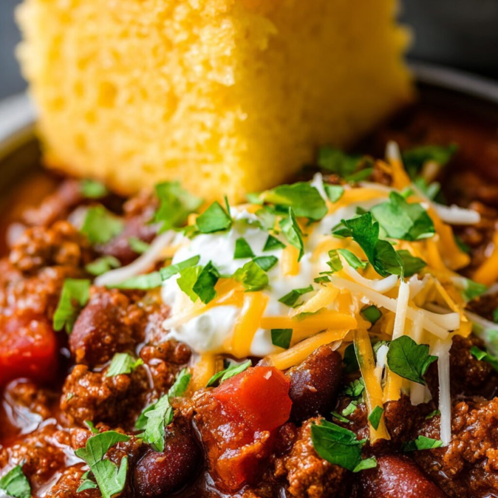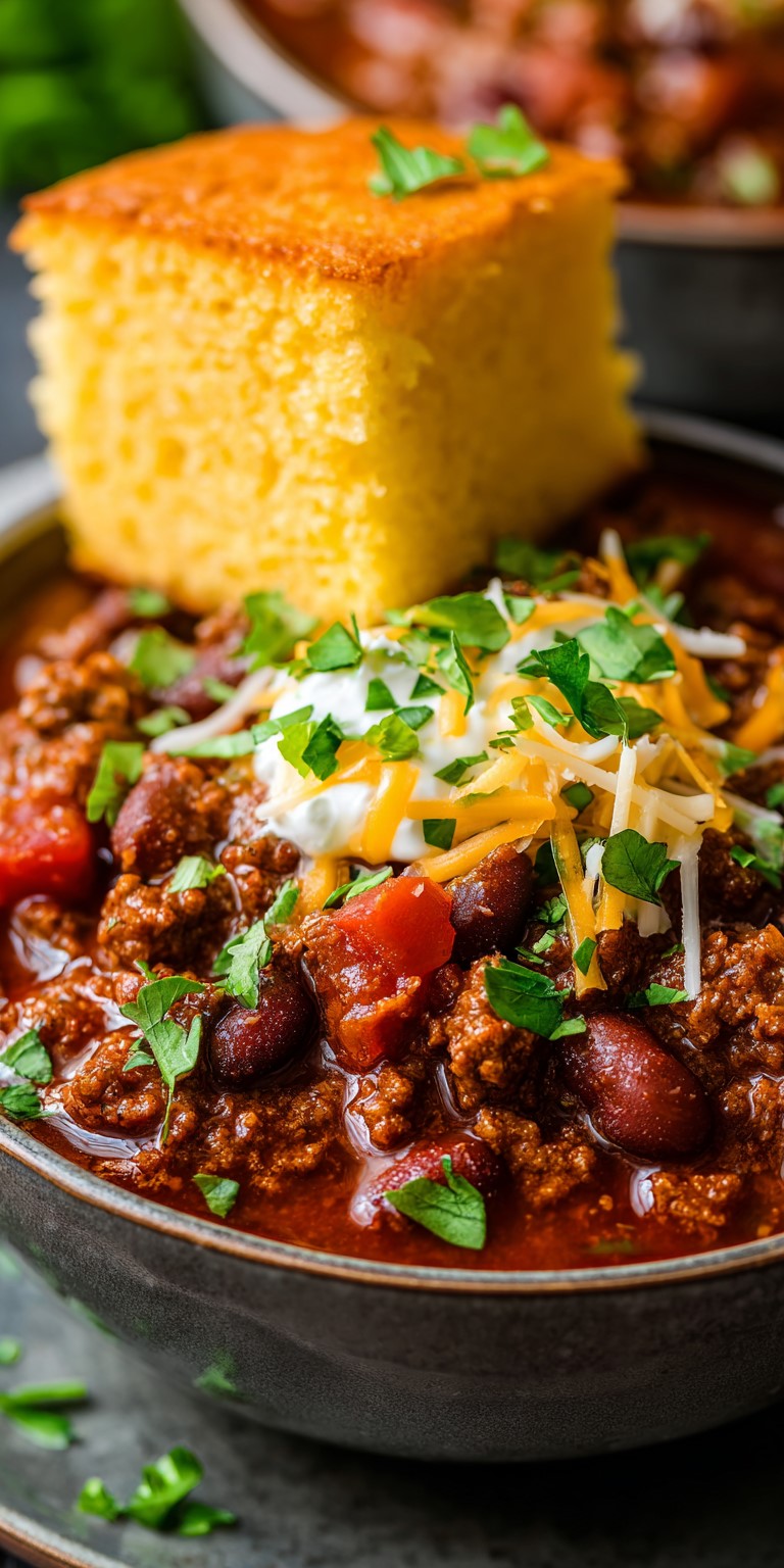 Cornbread and Chili is the ultimate comfort food, blending savory flavors with a golden, cheesy topping.