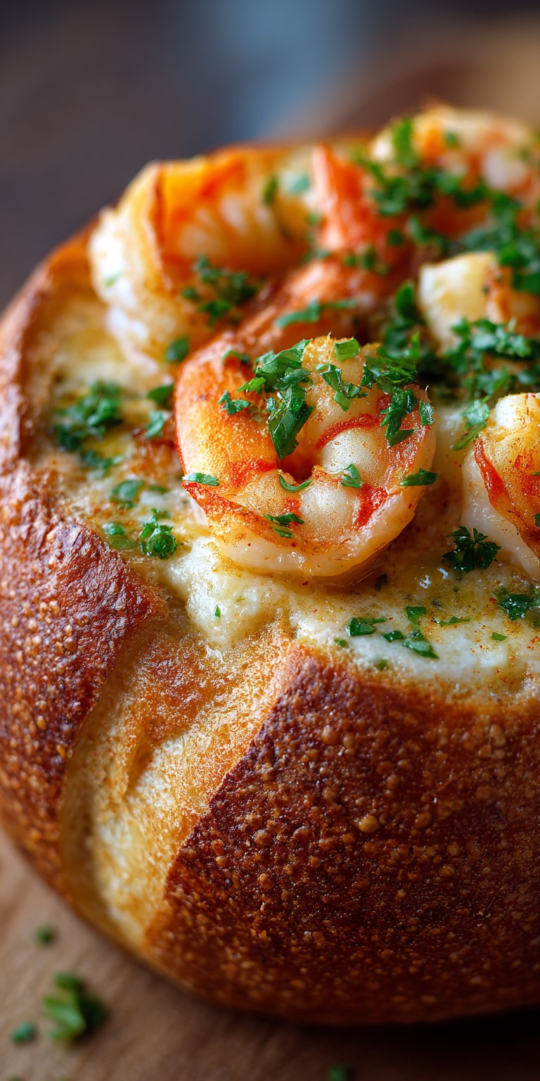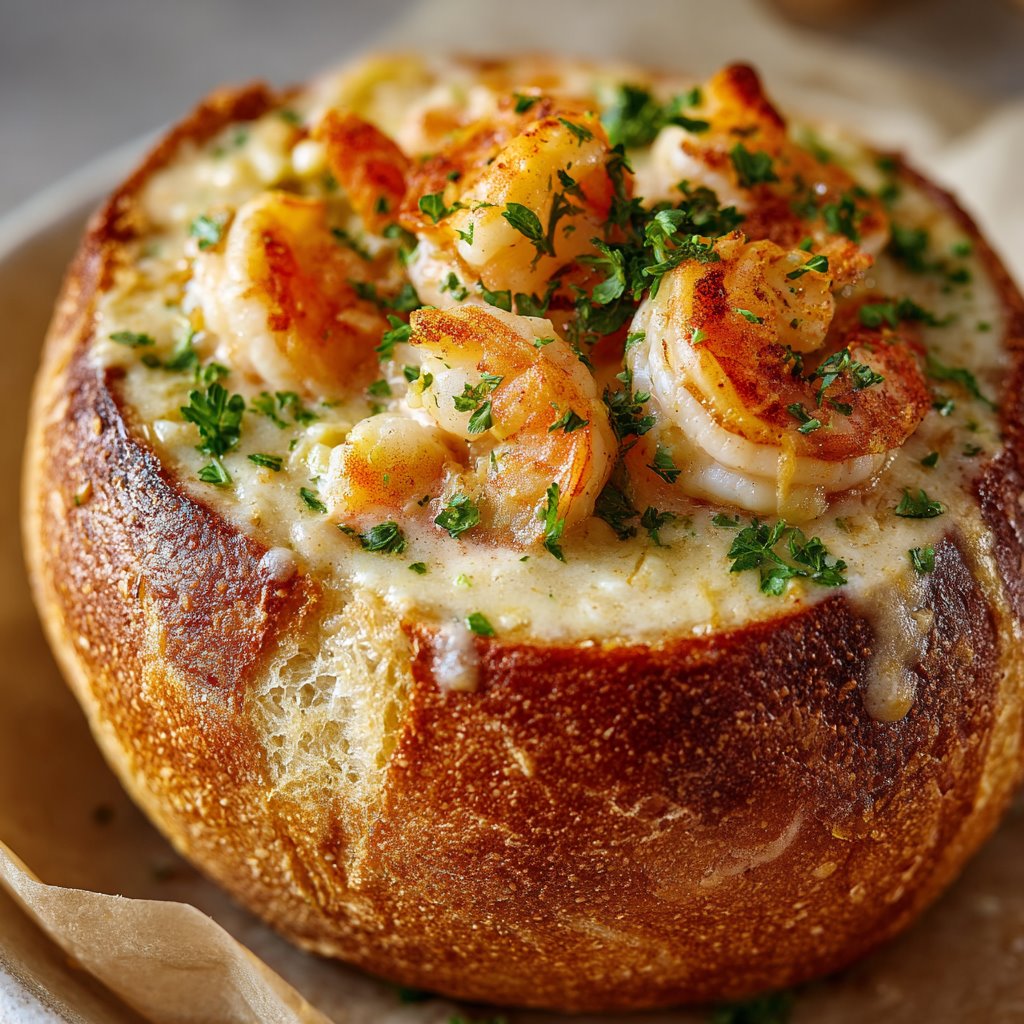 This stuffed bread bowl is the ultimate comfort food — warm, creamy, and full of seafood flavor.